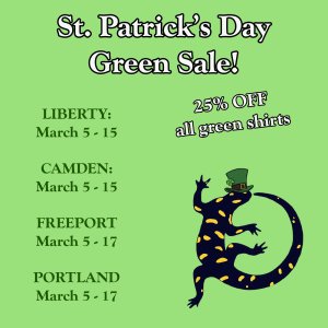 Our retail stores are holding a St. Patrick’s Day Green Sale!25% off of all green shirts!
