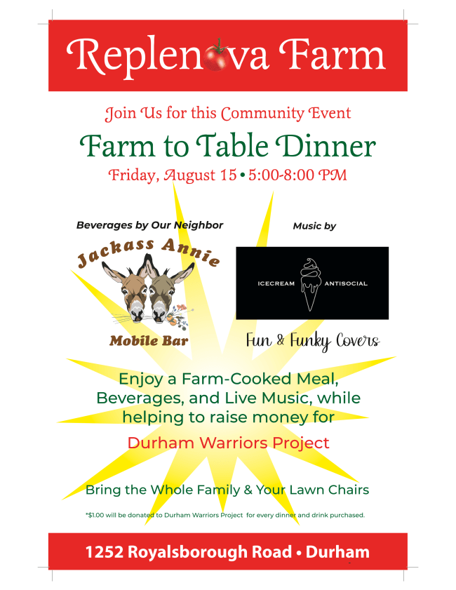 This is our final summer charitable and community event, featuring a Replenona Farm-made supper with drinks provided by Jackass Annie's Catering. Live local music. Picnic…