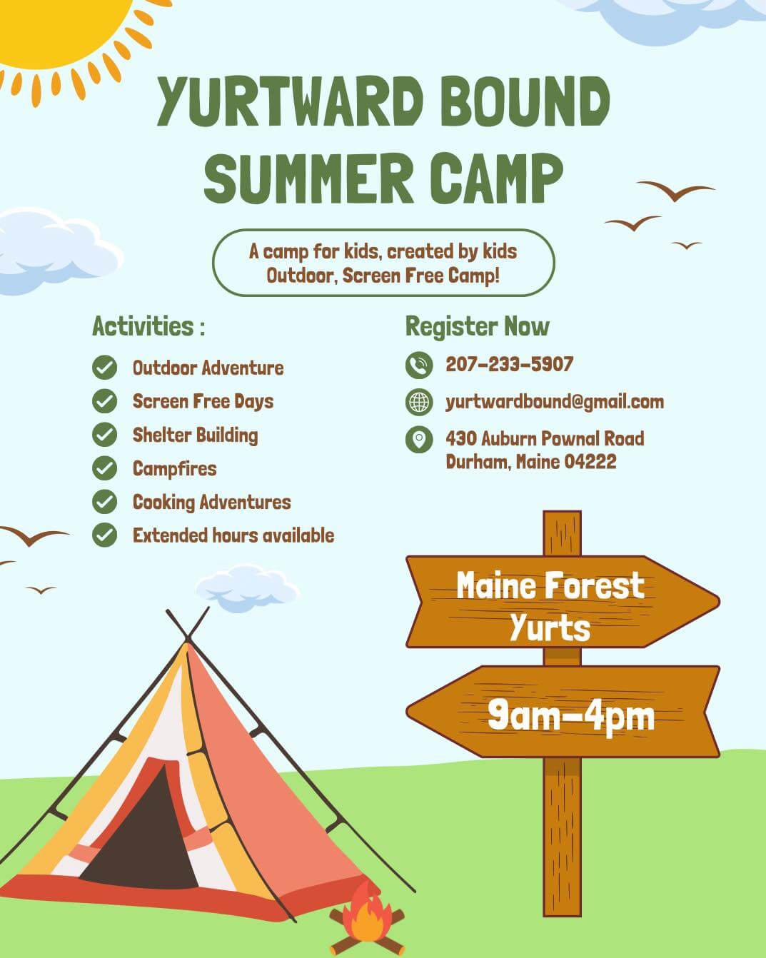 A camp for kids, created by kids! Outdoor, screen-free camp! Register now! Maine Forest Yurts 430 Auburn Pownal Rd, Durham, ME 04222 207-400-5956 maineforestyurts.com
