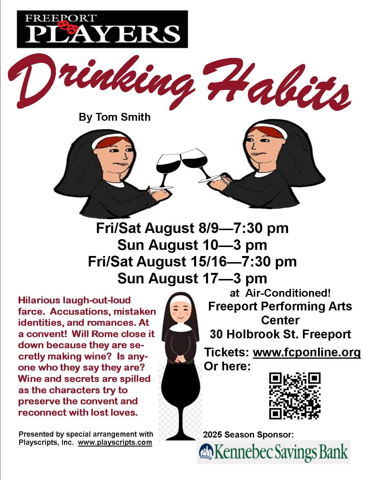 Freeport Players presents a hilarious farce, Drinking Habits, by Tom Smith, at the Freeport Performing Arts Center (FPAC, 30 Holbrook St.) on two weekends, August…
