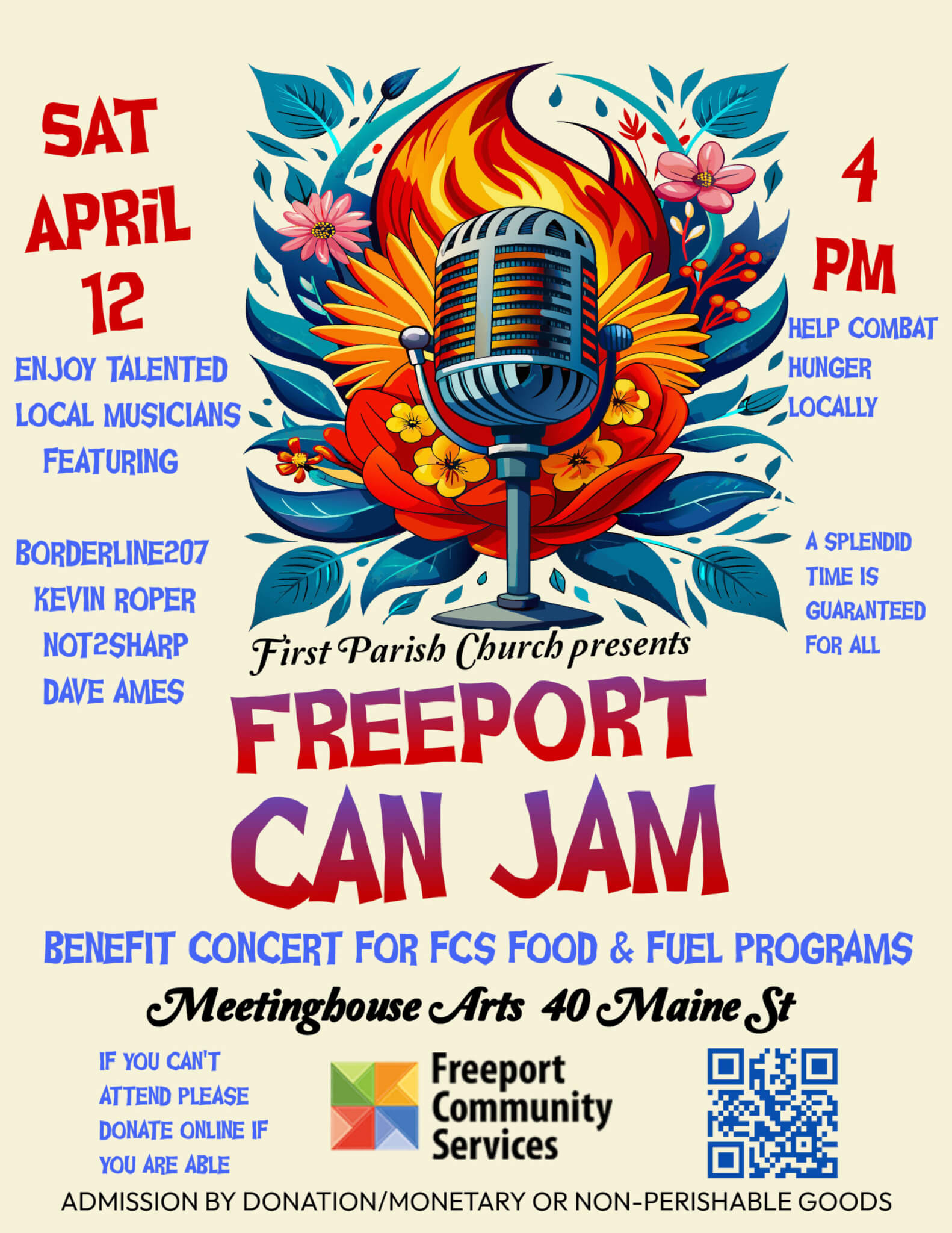 Together we jam! Featuring performances by: Not2Sharp Kevin Roper Borderline 207 David Ames Admission by monetary or non-perishable food donation in support of Freeport Community…