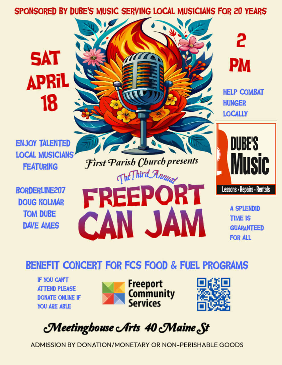 Help combat hunger locally! Enjoy talented local musicians, featuring Doug Kolmar Borderline207 Tom Dube Dave Ames Admission by monetary or non-perishable food donation in support…