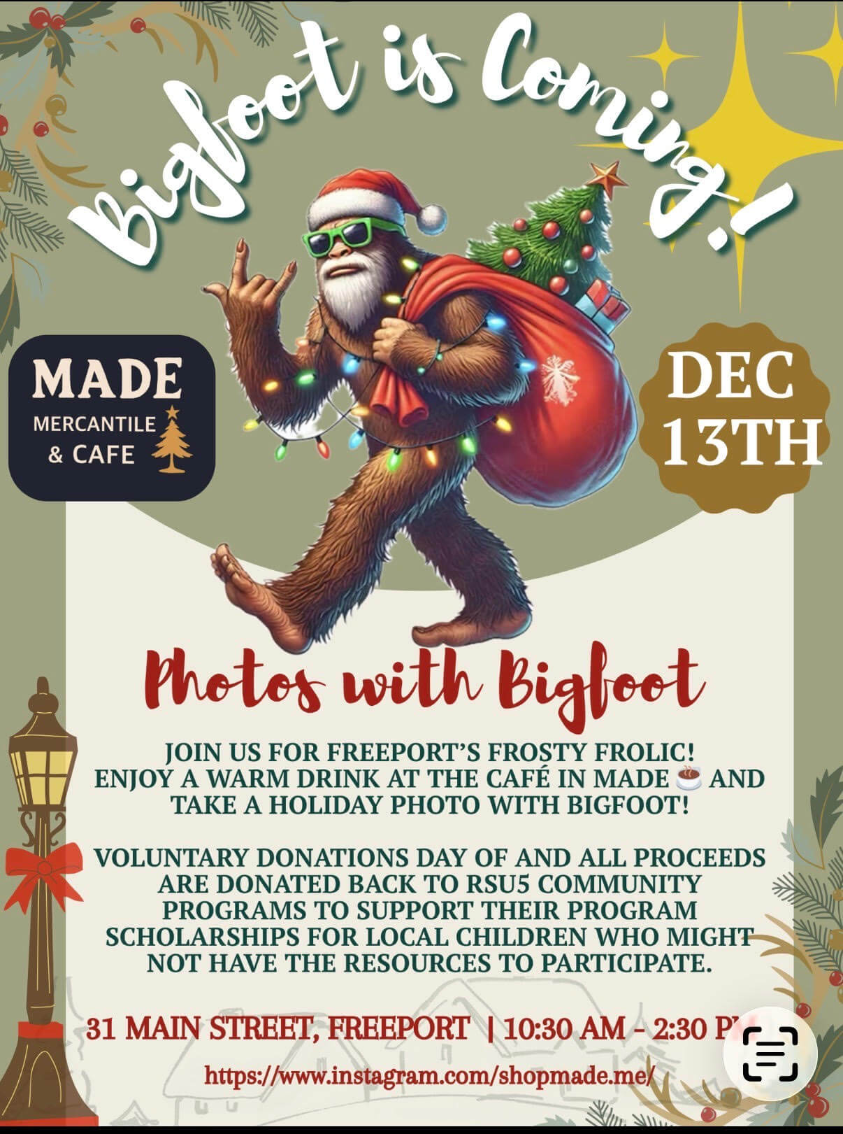 Enjoy a warm drink at the cafe in MADE & take a holiday photo with Bigfoot! Voluntary donations. All proceeds are donated to RSU5 Made…