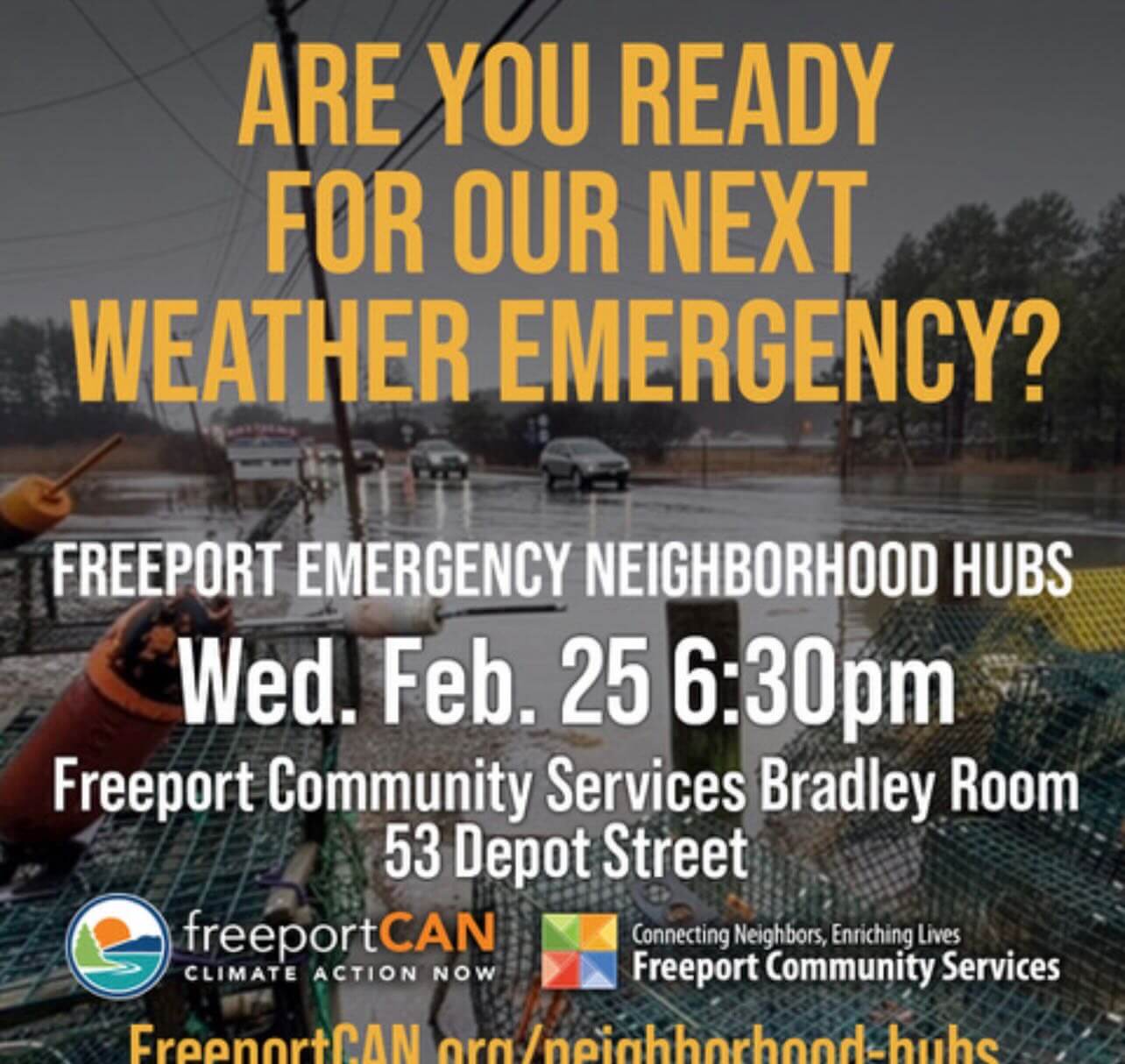 Wednesday, February 25th we will meet again at Freeport Community Services, Bradley Room. The meeting is open to all: we need your ideas, your energy, your skills and your care. Bring a neighbor or two and help us get started in your neighborhood. Disaster Training Opportunities will be presented by Brittany O’Neil from Cumberland County Emergency Management.