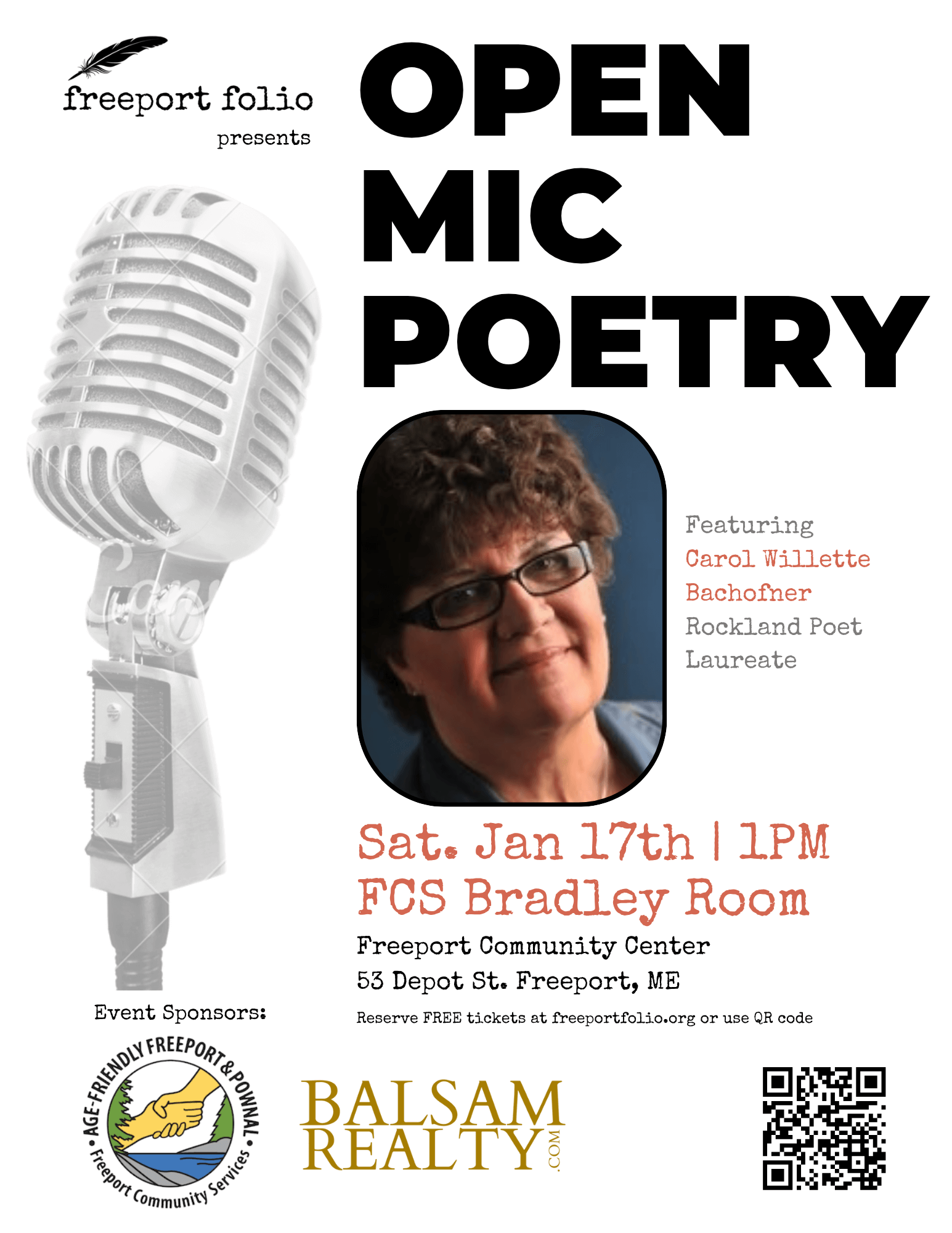 Freeport Folio – Open Mic Poetry with Featured Poet Rockland Poet Laureate Carol Willette Bachofner