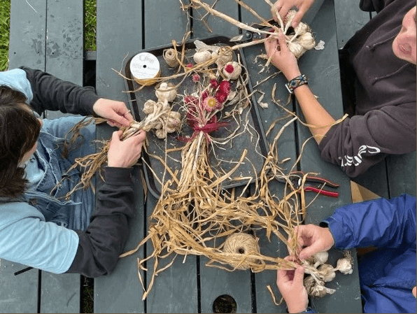 Garlic braiding dates to ancient Greece and continues to be practiced today as a way of preserving and storing garlic while also decorating our homes. We are anxiously watching as our soft neck garlic grows and will be harvesting it to dry soon. We look forward to gathering in September to create 5 head garlic braids together. We hope you join us!