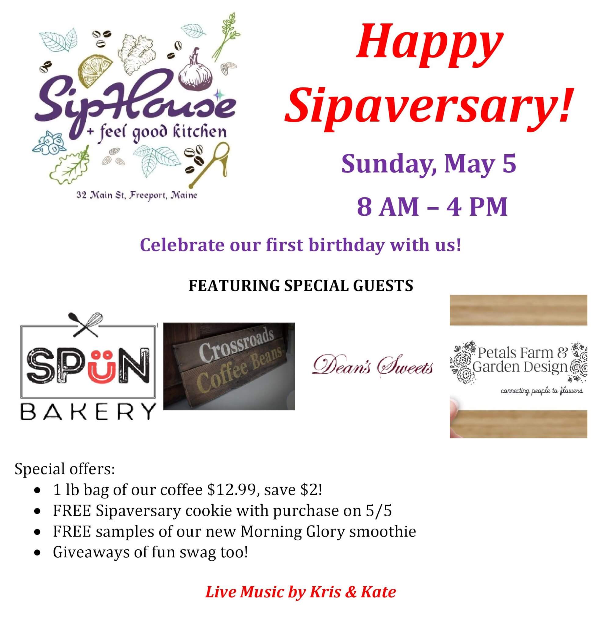 Celebrate our first birthday with us on Sunday, May 5 from 8 am – 4 pm