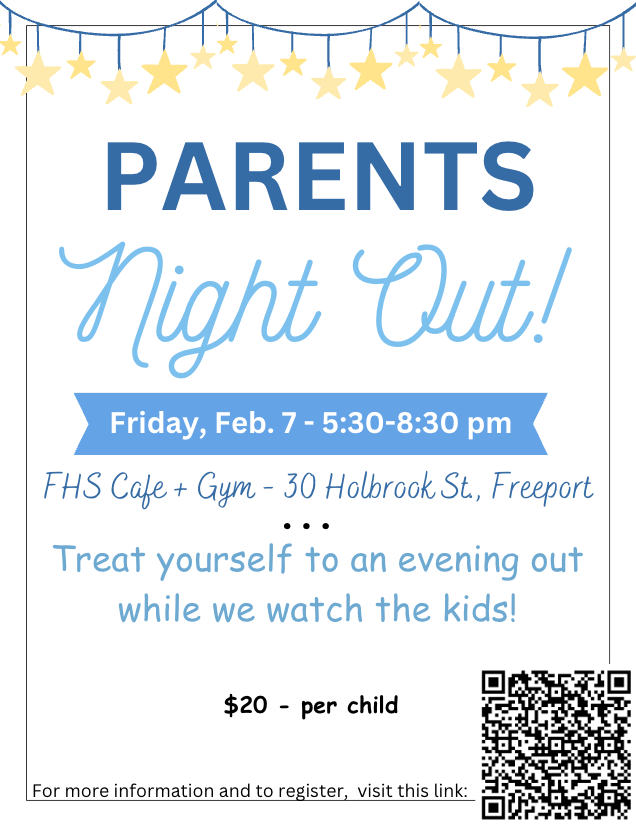 The event will take place in the Freeport High School Cafe and Gym on Friday, February 7th from 5:30 – 8:30 pm. It costs $20 per kid. We will provide dinner: pizzas, snacks, drinks, etc., but kids are free to come with their own as long as it is nut-free. We will also provide fun activities for kids to participate in with our High School Helpers and Red-Cross certified volunteers while parents enjoy their night. At Parents’ Night Out, there will be a variety of supervised activities that your kids can shuffle between including crafts, board games, G-rated movies, gym games, and face painting! The event begins at 5:30, however, parents are free to drop off and pick up their kids whenever they like as long as it is within the time that the event is operating.