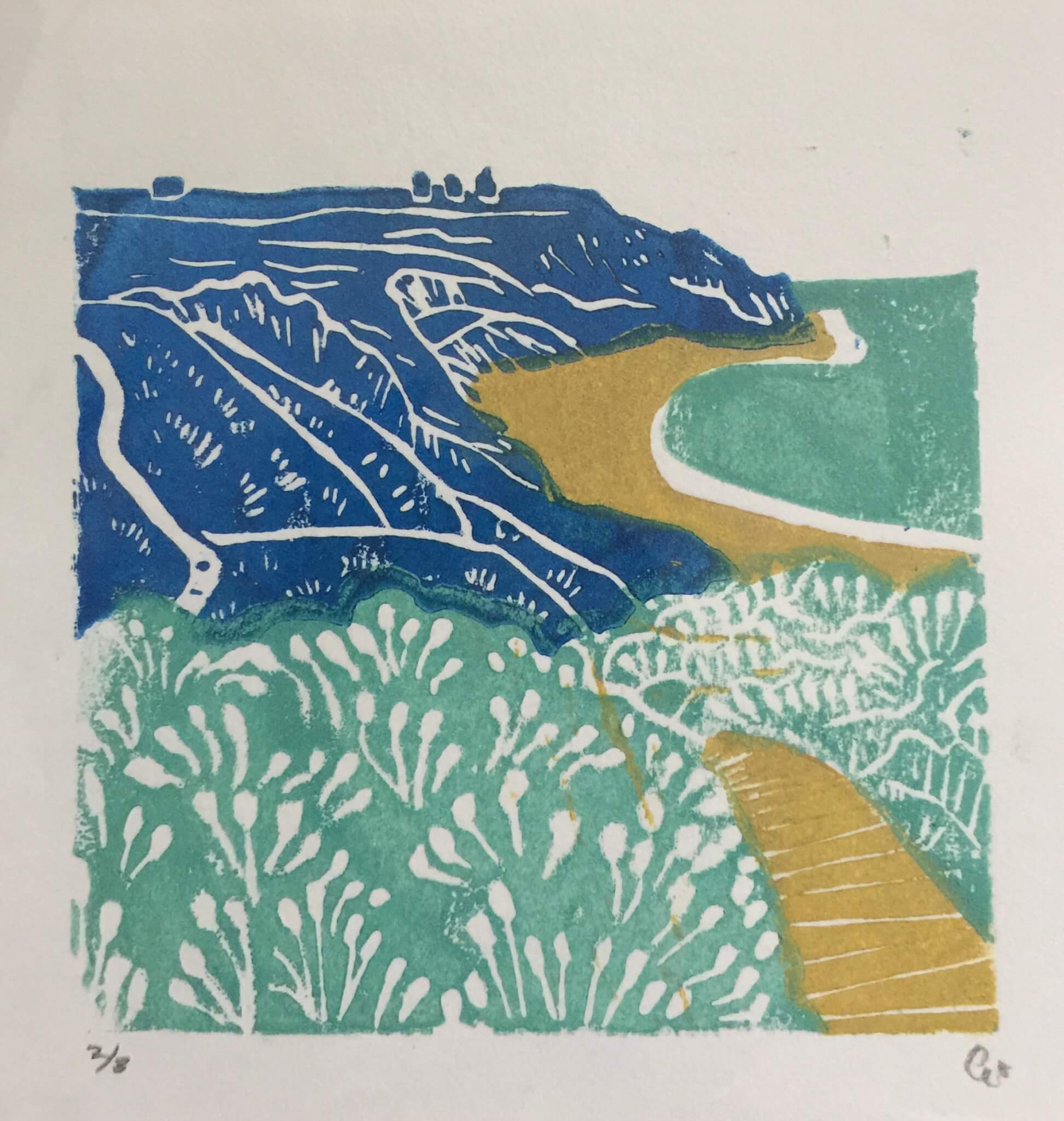 Annie is a Portland-based printmaker who makes richly colorful block prints of nature-scenes and everyday life. She sell her prints as digitally printed greeting cards, framed originals, and block-printed clothing. She dyes the clothing by hand before printing to create one-of-a-kind T-shirts, longsleeves, sweatshirts and scrunchies! She loves making her prints wearable and accessible. She also makes small oil paintings of landscapes and animals that echo themes of her prints. She gets many of her ideas for new prints while walking her dog Luigi around the Maine coast.
