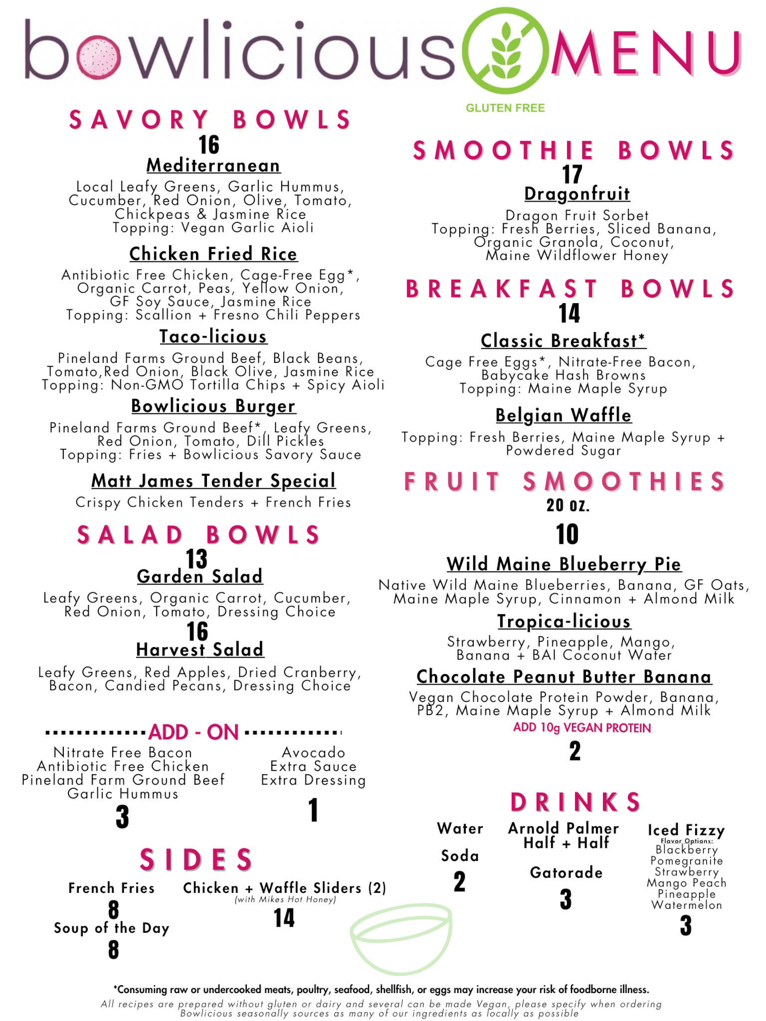 We are Bowlicious from Topsham Maine. Our mission is to provide delicious, nutritious and flavorful foods that are 100% gluten free. Our menu includes fresh and nutrient-dense foods that will leave you and your tastebuds feeling satisfied, energized, and ready for whatever comes next. We will prioritize quality and locality of ingredients when crafting our tasty bowls.