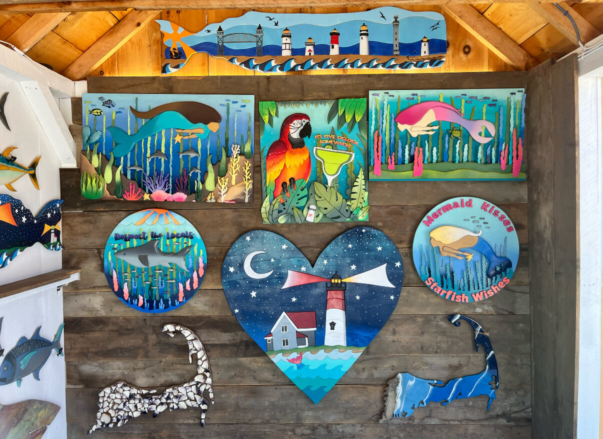 All of my work is created by hand - each piece is uniquely hand crafted and hand painted. Most of the pieces are crafted from reclaimed/scrap wood found in New England. My themes are typically “nautical,” - varieties of fish, sharks, whales, lighthouses and of course, Parrothead inspired pieces. I am lucky enough to do something that provides JOY for other people…. Website: https://www.capecodlandshark.com Social: https://www.instagram.com/capecodlandshark or https://www.facebook.com/capecodlandshark