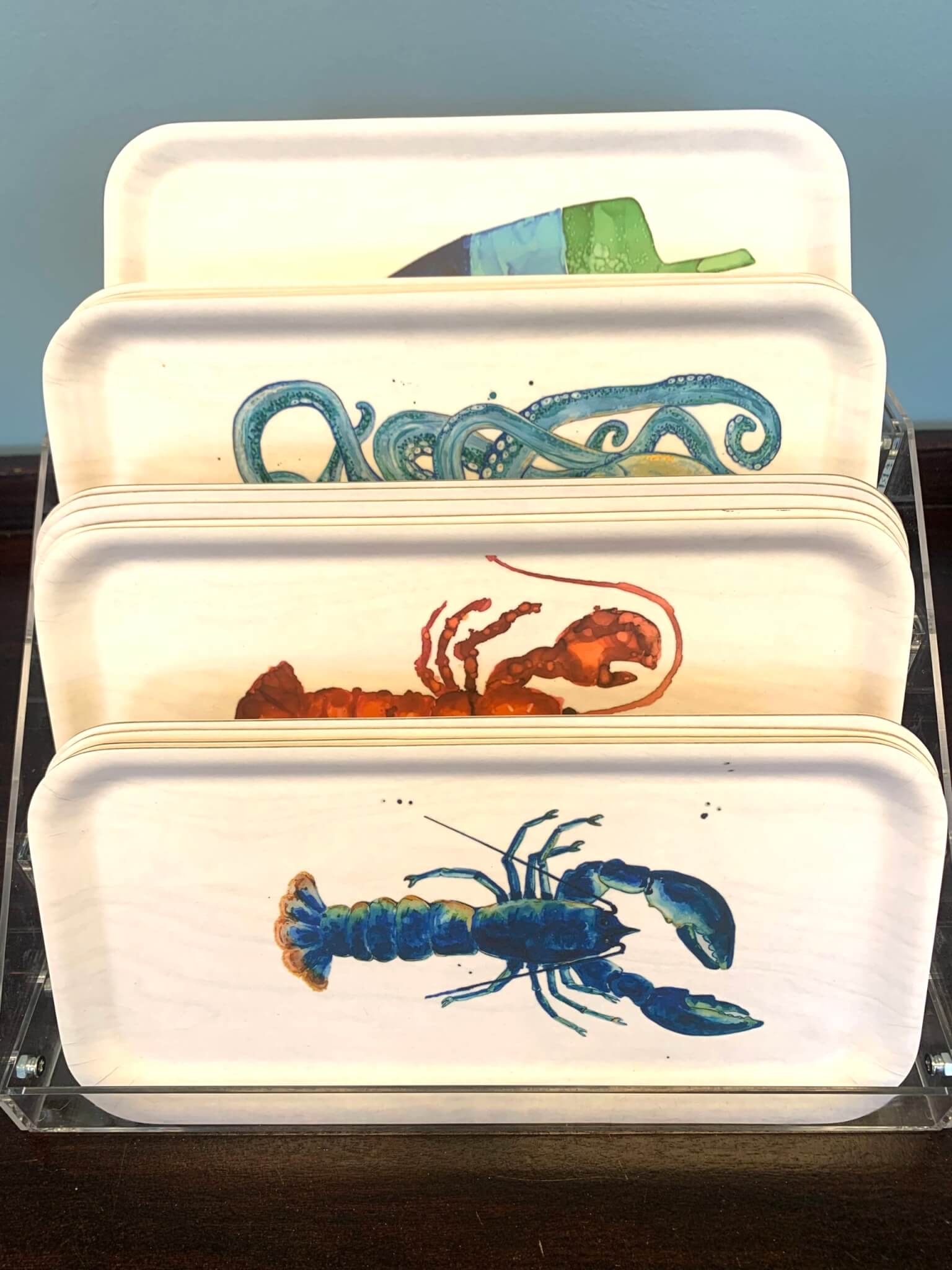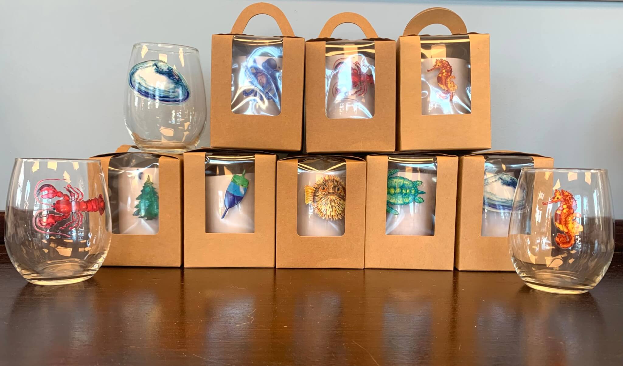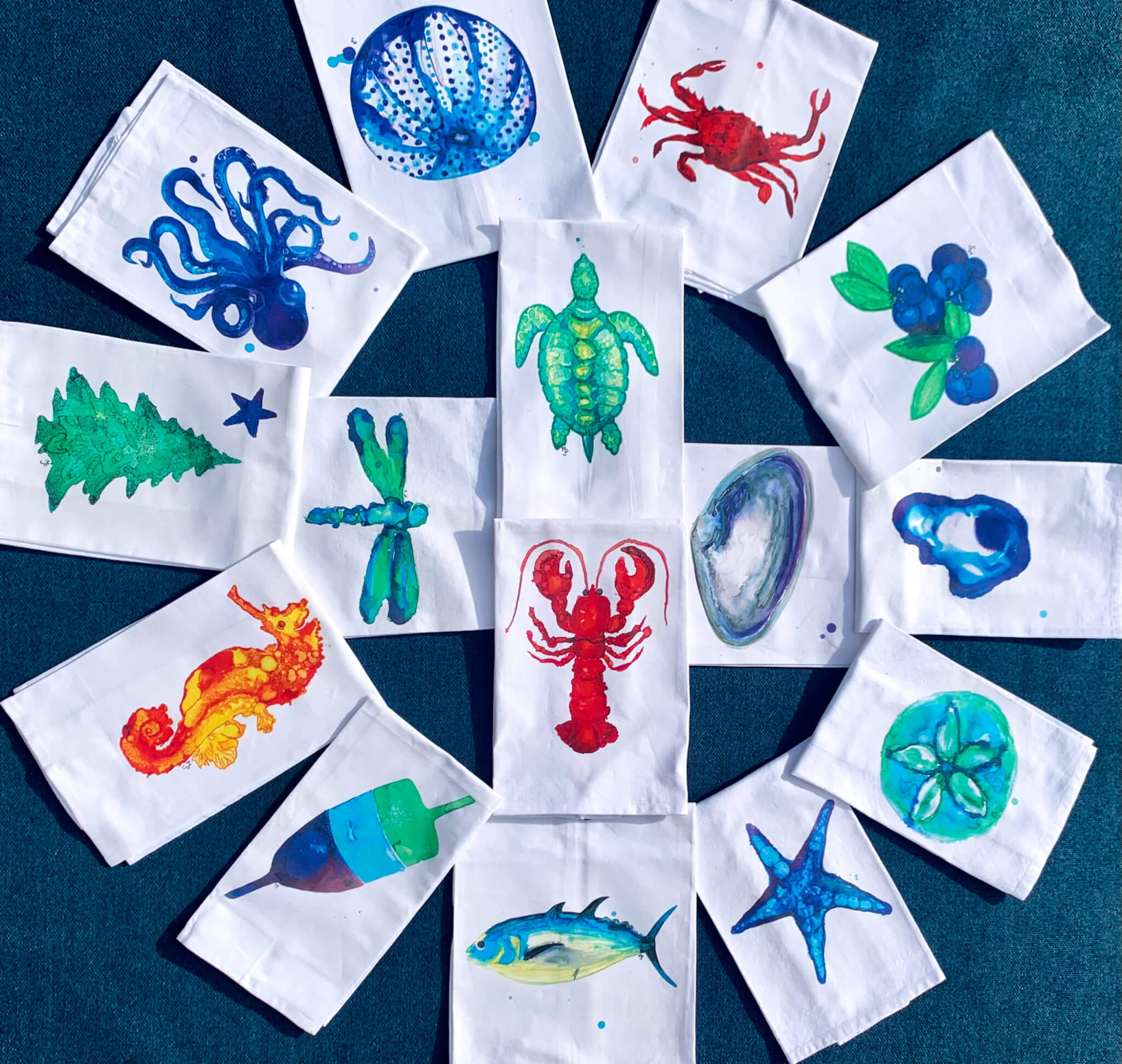 I am a coastal alcohol inks artist who lives in Yarmouth Maine. Alcohol Inks are vibrant inks that need rubbing alcohol to make them move and flow. I have been an artist all my life but have been fascinated with these inks for their intense color, movement and watery nature that they bring to my paintings. Once I have an image I love I have it printed on home goods so that people can enjoy art in a variety of forms. I use American made and Earth friendly products to place my art on. Examples of this include prints, notecards, tea towels, wine glasses, beverage coozies, napkins, trays, insulated cups, notepads, notebooks and stickers. My prices range from 5.00 to 150.00.