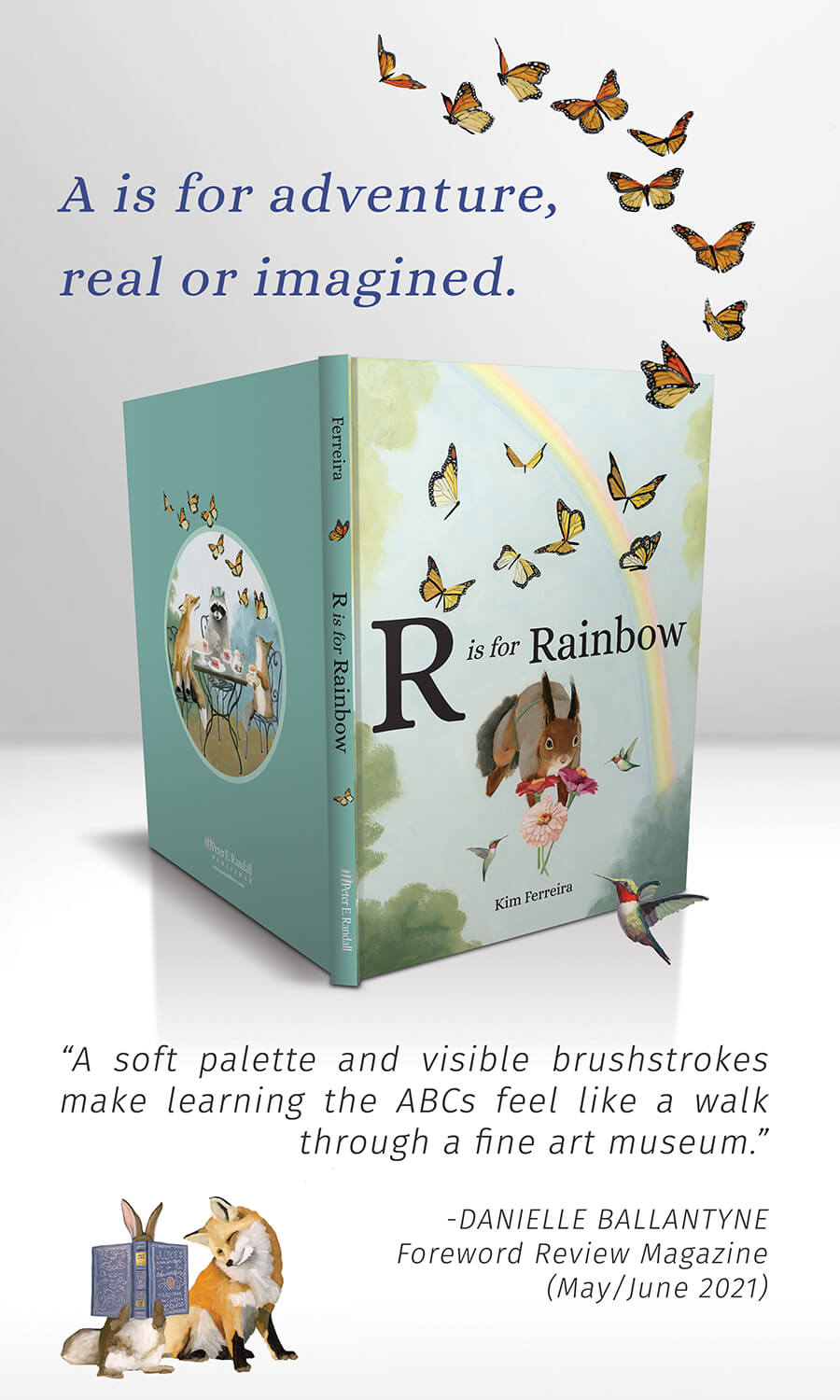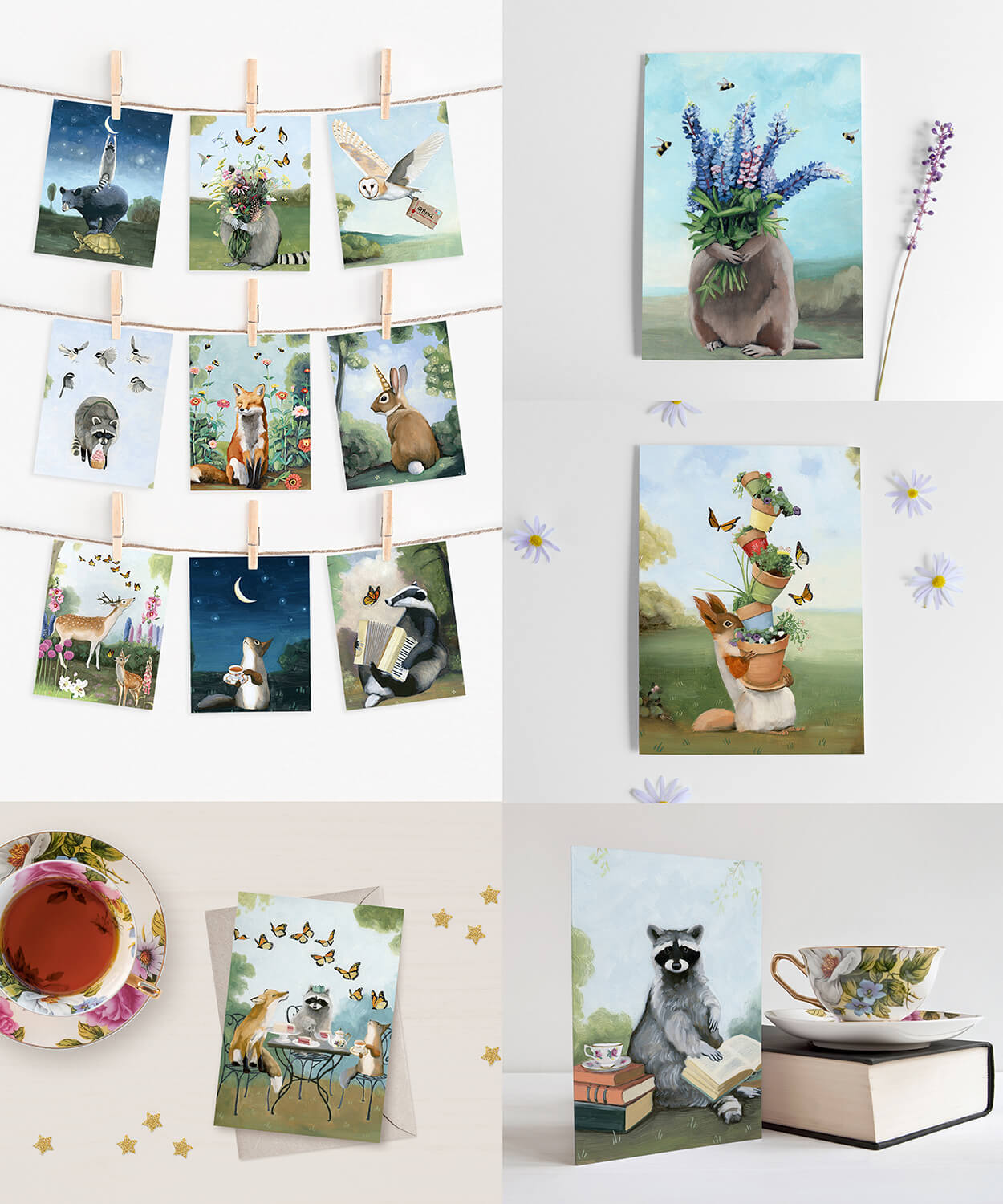 Raised in a log cabin in the woods, Kim Ferreira now lives in Portsmouth, NH, a lovely little city by the sea. Her winding path as an artist began with a B.F.A. from the University of New Hampshire. Soon after, she opened an art gallery which she owned and operated for ten years. After becoming a mother in 2017, Kim’s focus in painting shifted from self-portraiture to anthropomorphic woodland animals against a backdrop nodding to french rococo landscapes. Her work is inspired by simple pleasures and the exuberant enjoyment of life, what the French refer to as “joie de vivre”. In addition to original oil paintings, her offerings include limited-edition prints, a line of stationery including note cards, stickers, washi tape, gift wrap; And an all ages picture book. She is also a venturous baker, a soy candle-maker, a dreamer, a brown-eyed girl, a cat lover, a pisces, a not-so-neat freak, and a do-it-yourself-er. She is obsessed with her garden and brakes for squirrels.