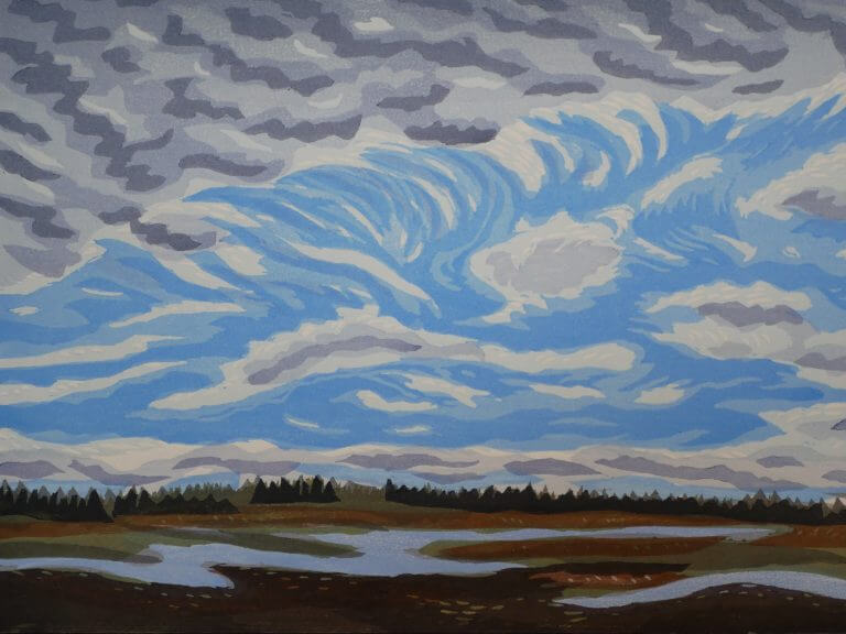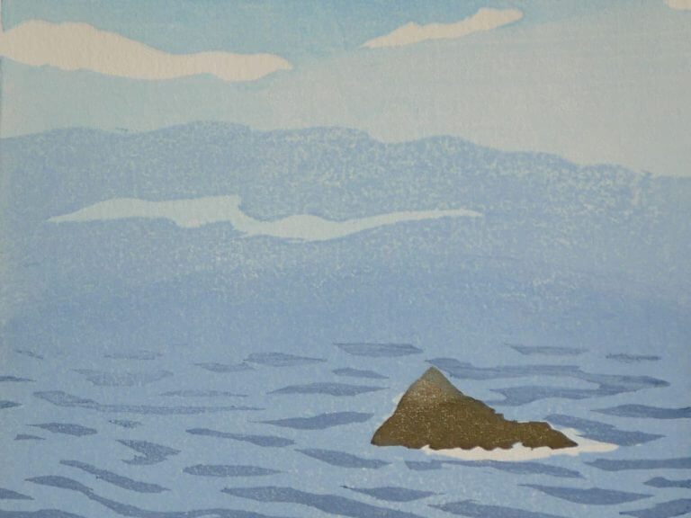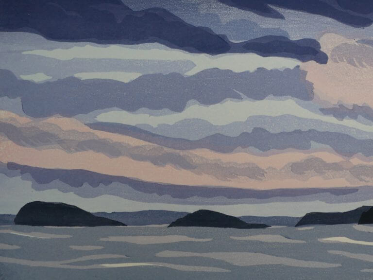 Linda Mahoney creates color woodblock prints using the Moku Hanga technique (Japanese watercolor woodblock print.) She paints plein air watercolors at various Downeast Maine locations as studies for her prints. She cuts several woodblock for each print, usually one for each color, and prints them by hand with a baren, the lighter blocks first and progresses to the darkest color. Colors are lightfast and the papers and framing materials art archival. Prints are available framed and unframed.