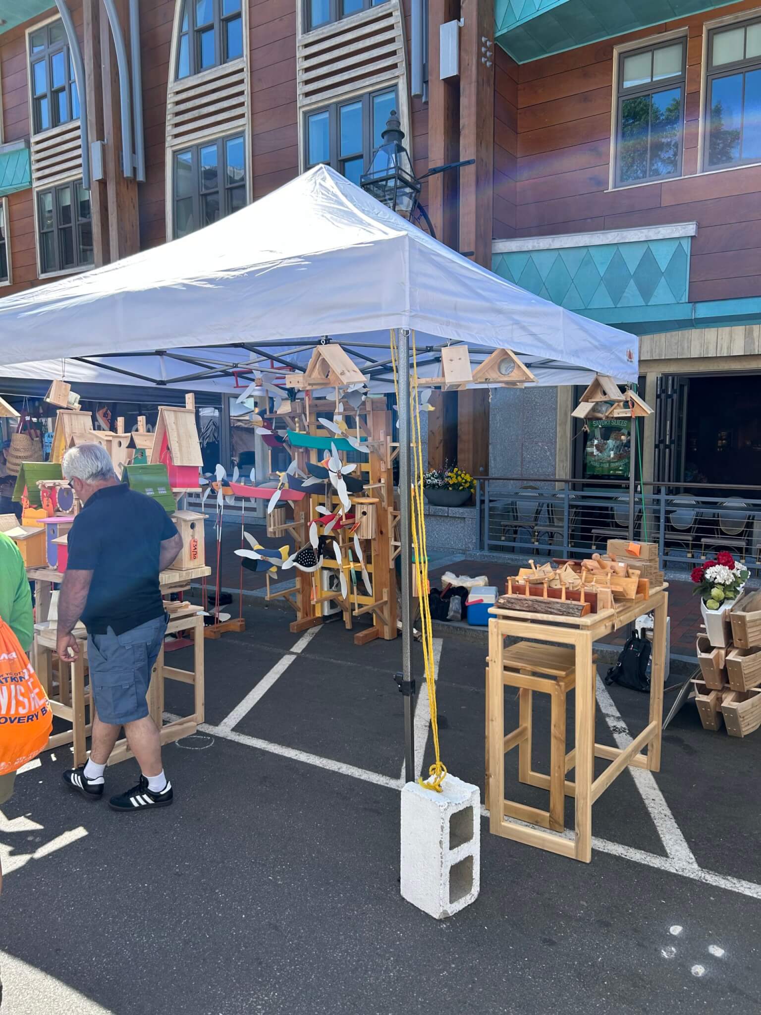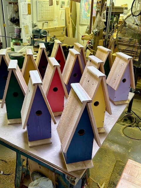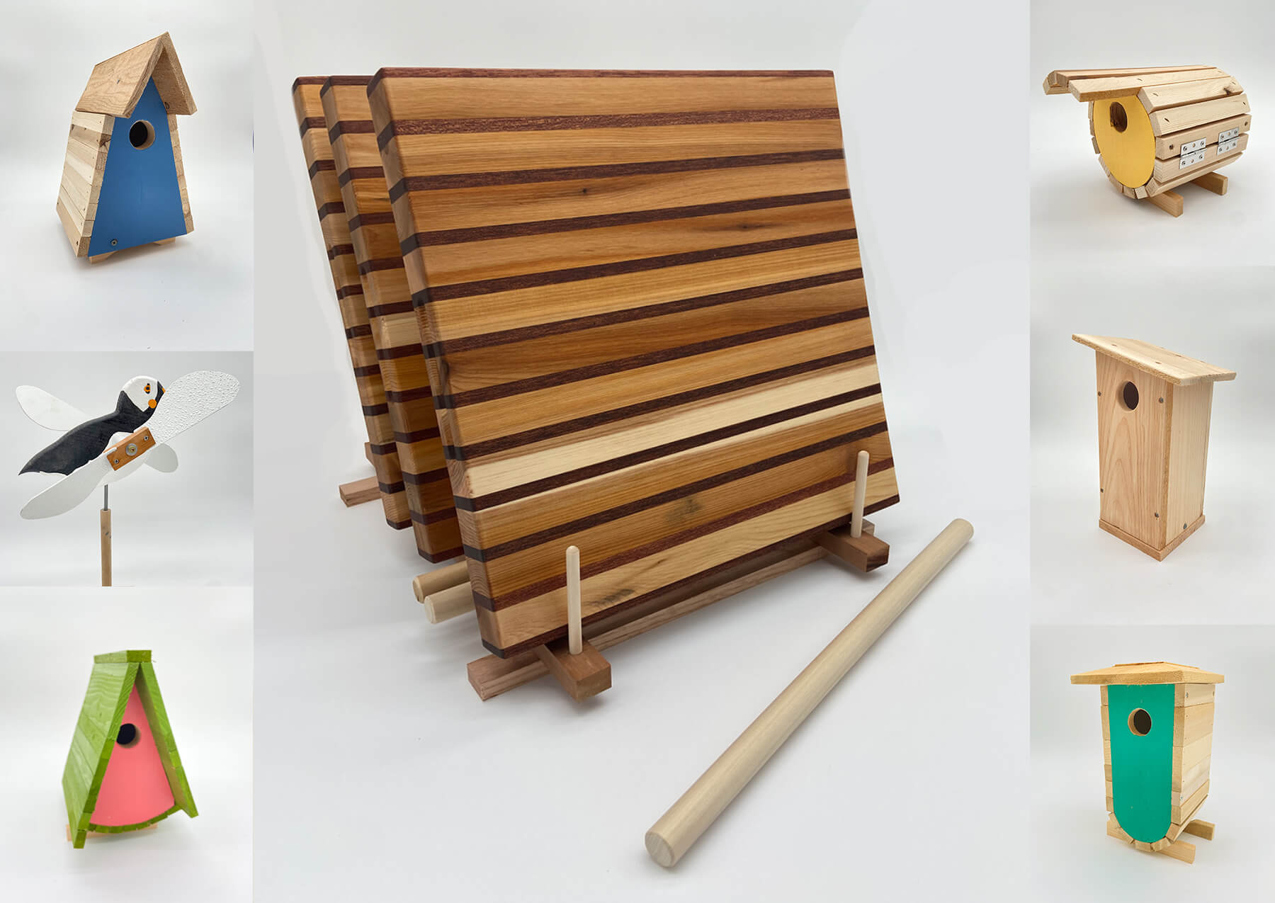 All products made of Northern White Cedar (sourced in Maine). Lumbers begins as outdoor chairs and rockers. Then I build complimentary pieces like outdoor end tables and foot stools. What’s left are cut-offs of various size and shape. Those cut offs help to craft houses for birds, whirligigs, pizza boards, peg racks, dory planters, and more. Make 10 unique houses for birds, 30 different whirligigs. I’m frugal with lumber. Waste from lumber is just sawdust and small amounts of burnable scraps.