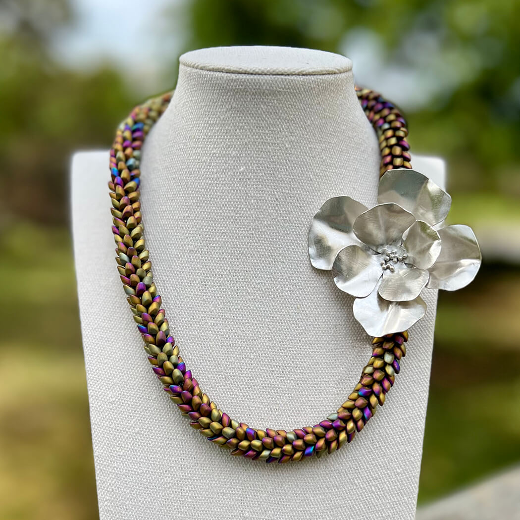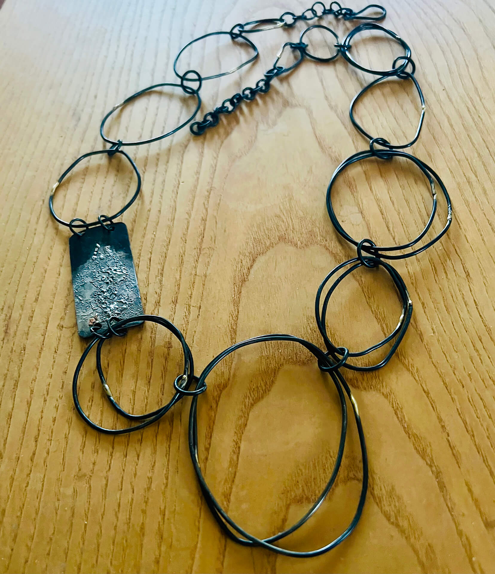 Primarily self-taught, I have learned through curiosity and experimentation as well as through a variety of workshops, including at Haystack and Penland School of Crafts; Zoom workshops in all aspects of creating jewelry with steel, including adding precious metals to steel. I create jewelry in several media: silver rings, bracelets, necklaces, and earrings with textures from leaves and other surfaces, 24k gold Keum Boo, precious gemstones and karat gold embellishments; necklaces, bracelets, and earrings in low carbon steel in sheet and wire form, also with textures, 24k gold Keum Boo, and karat gold embellishments. I particularly love creating unusual surface textures by etching and/or fusing other metals (gold, silver, bronze) to the steel. All of my steel pieces are patinated black, sealed with penetrating oil, and finished with metal wax buffed to a soft sheen. In addition, I make beaded necklaces and bracelets, using the Japanese 8-strand braiding technique called Kumihimo. My latest pieces have my own handmade sterling silver clasps. I love the Japanese concept of Wabi Sabi, and strive to bring it into all of the work I make, and most especially in the steel pieces.