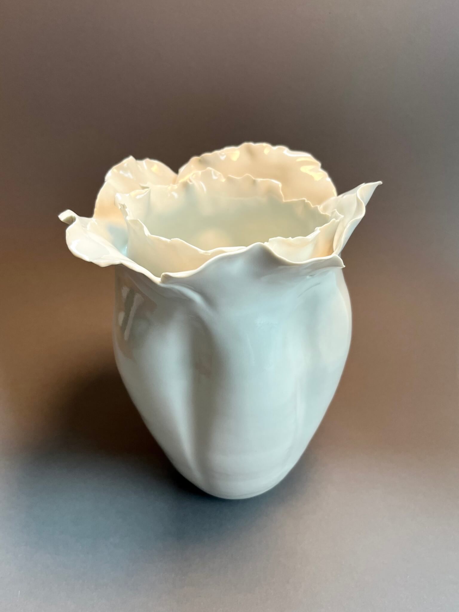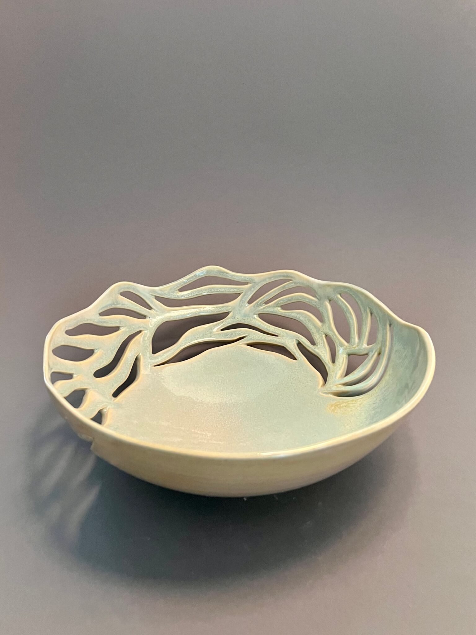 I throw the clay, both porcelain and stoneware, on a treadle wheel then alter my pieces before firing to cone 6 in an electric kiln.My work is both functional and decorative. My pieces are inspired by the delicacies found in nature. I incorporate the graceful movements, colors and textures of nature into my work. Flower petals, ocean waves, clouds, tree leaves, shells and the wind all influence my work.